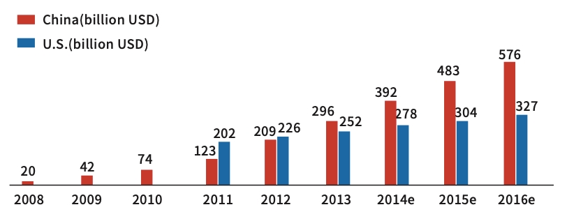 電子商務概念起源于美國。而與之相匹配的美國現代物流自1915至2000年已有85年的歷史,美國是在物流系統和信息系統已發展到很高水平的前提條件之下,利用電子數據交換技術(即EDI,也就是電子商務的前世),目的就是為了簡化訂單的處理過程從而加快物流運行速度,提高物資利用率。電子商務的提出同時也是為了解決繁瑣的信息流、商流和資金流的處理對現代化物流過程的緩滯,從而進一步提高現代化的物流速度。 圖2是美中電子商務市場規模發展趨勢分析。