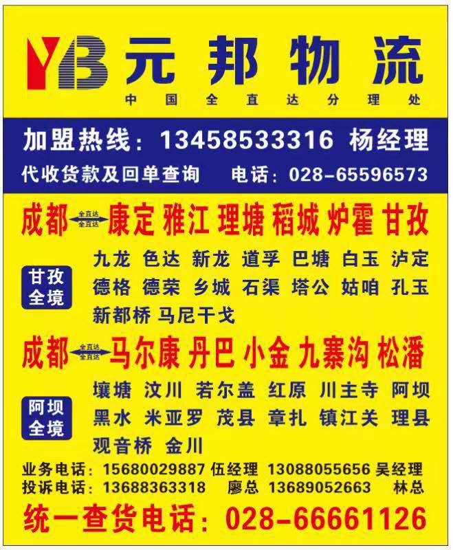 成都到稻城物流專線【元邦物流,簡單快捷,專線直達,天天發車 】成都:028- 83902577 手機:13688363318聯系人:廖經理茂縣、汶川、理縣、馬爾康、黑水、松潘、九寨溝、金川、紅原、若爾蓋、壤塘、阿壩縣、色達、石渠、甘孜縣、德格、白玉、新龍、道孚、丹巴、雅安、康定、雅江、理塘、巴塘、得榮、鄉城、稻城、九龍、木里、攀枝花、寧南、西昌、雷波、越西、馬邊、漢源四川元邦流有限公司“一直被模仿,從未被超越,創造品牌,以誠信取勝?!睍r間證明一切,每天進步一點點。